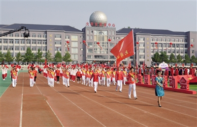 开幕式上,伴随着激扬雄壮的歌曲,国旗队、标语队、裁判员等方队及各学校代表队,踏着稳健的步伐,昂首阔步依次进入会场。平城区代表队的武术《英雄少年》、天镇县代表队的韵律操《青春的朝阳》、大同三中代表队的旗舞《中国龙》……特色展示轮番上演,精彩纷呈,展现了我市中学生朝气蓬勃、奋发向上的精神风貌和运动风采。云冈区职业中学表演的国家级非物质文化遗产——威风锣鼓《开启新征程》将开幕式推向了高潮,48面鼓摆出了气势恢宏的鼓阵,展现了我市职业教育发展路上的豪迈气魄。最后,教师代表们深情演唱《我和我的祖国》,表达了对新中国成立75周年的真挚祝福。