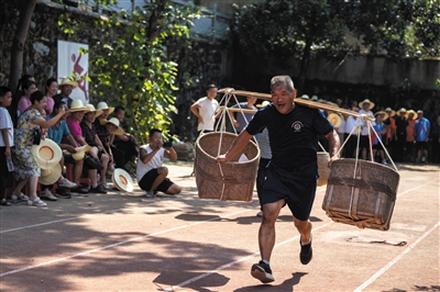 ▲9月28日,在桃江县高桥镇中心学校,村民在进行运粮接力比赛。