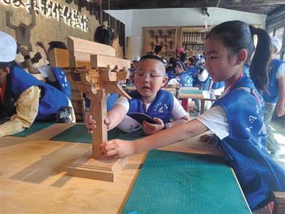 “古城灵丘院占地约900平方米,以‘红色灵丘’‘古色灵丘’‘有机灵丘’为主题,集声、光、电、实物展示于一体,是一个展示灵丘文化和特色产品的展览馆。”活动中,工作人员带领我们参观了各个展厅。“老师,灵丘的特产有很多,我吃过黄烧饼、喝过苦荞茶……”在有机食品市肆,展示了灵丘的特色产品;在非遗文化展示区,我们参观了灵丘县的传统文化和非物质文化遗产,对罗罗腔、灵丘打铁花等有了深刻了解;红古灵丘展示区内,工作人员介绍了当地历史文化景点。此外,在木工体验坊,工作人员以“榫卯”为主题,介绍了榫卯结构的起源,解读了榫卯的类型和拼插原理。随着对榫卯结构的了解,我们对榫卯的兴趣越来越高,迫不及待地动手拼接。大家一边仔细观察木条结构,一边不停变换角度……