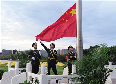 图为伴随着雄壮的《义勇军进行曲》,升旗手高高扬起国旗。