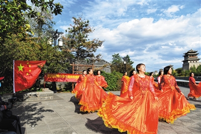 为庆祝中华人民共和国成立75周年,昨日,我市各大公园、广场,爱好文艺的群众自发组织起来,以歌曲、舞蹈、戏曲等形式,表达热爱党、热爱祖国、热爱家乡的热情。图为大同市塞北情艺术团在城墙带状公园表演歌舞。