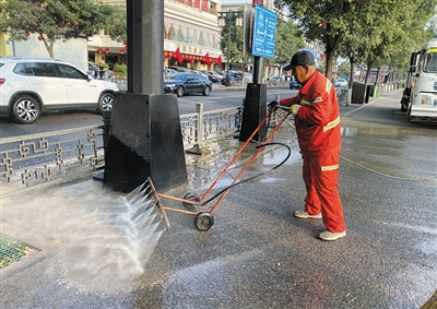 说话间,王志军看到一处油污,便喊来几个同伴,用高压水枪冲洗。“一会儿看看,如果冲洗不掉,就用洗衣粉去擦。国庆期间,我们要站好自己的岗,把卫生搞好,为游客创造一个好的旅游环境。”记者注意到,在古城内的各路段,路面洗扫车、垃圾收集车等正相互配合着进行清扫、清运工作。针对节日期间人车流量增多、保洁强度大等实际情况,平城区环卫服务中心及时调配保洁人员,加强对人流密集处的清扫保洁作业。