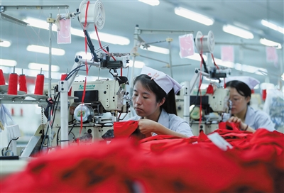 ▲10月7日,山东省青岛市即墨区龙山街道一家服装企业的工人在生产出口到海外市场的成衣产品。