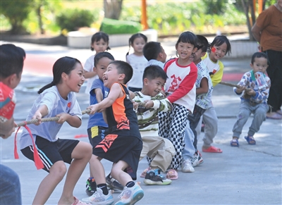 柳州市柳江区三都镇白见村板朝屯的小朋友们在进行拔河比赛(10月6日摄)。