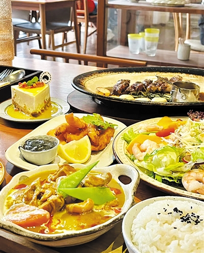 甜品方面,玫瑰荔枝小蛋糕味道清新,里面的荔枝果肉Q弹韧口,奶油细腻绵密,口感层次丰富,吃完幸福感爆棚。喜爱吃咖喱的小伙伴,奶香鸡肉咖喱值得尝试,相信你一定会喜欢。里面的咖喱味很浓,还带着一点奶香味,鸡肉的熟度也拿捏的刚刚好。饮品方面,葡萄柑橘苏打水很好喝,清新解腻,酸甜冰凉,在吃过一众油炸和甜品后有很好的清口效果,另外,芭乐果汁也很值得推荐。主菜方面,安格斯肉眼牛排,汁水充盈,炭烤的香气十足,主食可以选择番茄肉酱意面,一餐吃下来会感觉超满足。