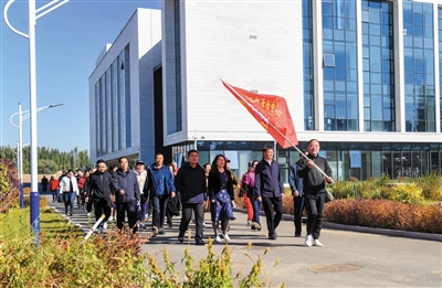 为展示离退休干部的精神风貌,弘扬尊老敬老优良传统,昨日,由市委老干部局主办的“银龄向党绽芳华 爱在金秋暖桑榆”重阳节系列活动在市老年大学暨老干部活动中心开幕,为期两天的活动共有9项内容,吸引400多名老同志参加。图为健步走活动。 本报记者 于宏 摄