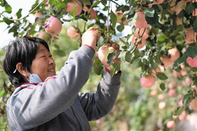 ◀10月12日,在天津市蓟州区马伸桥镇育英洼村,种植户在采摘苹果。