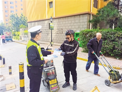 ◀ 近日,市公安局交警支队二大队民警走进社区、企业、学校,宣传“一盔一带”安全常识,并对不按规定佩戴安全头盔等违法行为进行整治,提高居民的文明交通意识和自我防护水平。