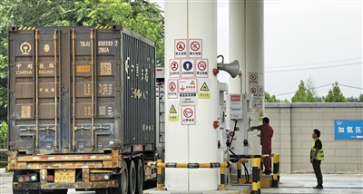 ▲北京大兴国际氢能示范区内全球最大的加氢示范站内,氢能源车辆在加氢(8月20日摄)。
