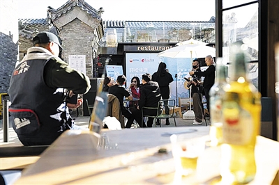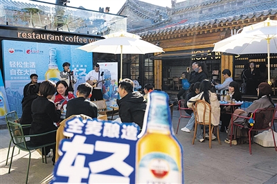 院里摆放的桌几边,人们三三两两随意落座,不时端详着桌子上的“红爵轻卡”。啤酒倒入杯中,宛如一幅流动的画卷,啤酒在杯中荡漾起金黄色的光芒,每一个小气泡从杯底升腾而起,聚集到杯口形成洁白的细密泡沫。