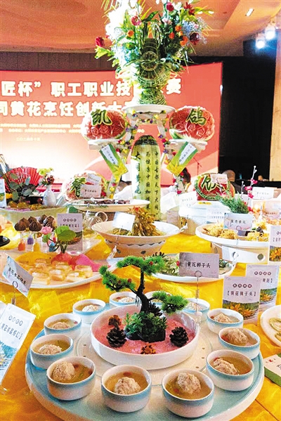 10月9日下午,第四届“工匠杯”职工职业技能大赛暨大同黄花烹饪创新大赛在大同宾馆贵宾楼大同厅如期举行。厅内厅外人头攒动,啧啧称赞声不绝于耳,近300道黄花菜品在大赛展上惊艳亮相;大同冰鲜黄花、黄花深加工产品、杂粮、黄芪凉粉、亚麻籽油等众多优质农产品及木兰冰激凌、醋、黄米凉糕、黄芪饮品、杏子酒、辽金红葡萄酒等新产品也引得人们驻足询问、品尝。