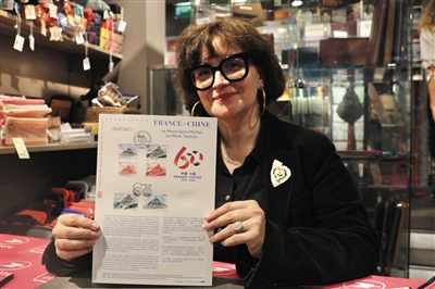 ▲10月18日,在法国巴黎举行的《中法建交六十周年》纪念邮票首发仪式现场,邮票设计者之一、法国艺术家桑德里娜·尚博展示邮品。