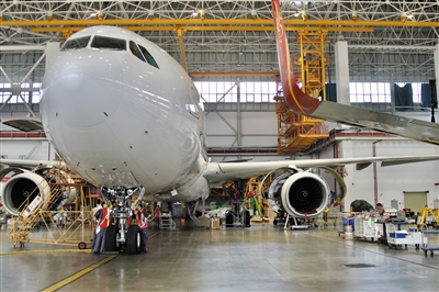 ◀10月21日,在海南自贸港一站式飞机维修产业基地内,海航航空技术有限公司的机务维修人员对进境飞机进行检修。
