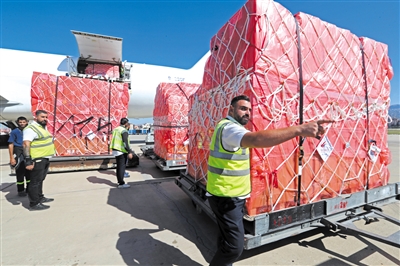 当地时间10月21日上午,中国援助的紧急人道主义医疗物资运抵黎巴嫩贝鲁特拉菲克·哈里里国际机场。据中国驻黎巴嫩大使馆介绍,这批物资总重58吨,包含麻醉剂、一次性使用气管插管、手术衣等多项黎巴嫩急需的医疗物资。 新华社发