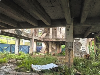循着指引,记者在南宁市良庆大桥南侧的邕江边看到一栋废弃厂房和几根残存烟囱。厂房墙壁上画满了各式涂鸦。周围野草肆意生长,随处可见尖尖的石头,一些裸露在外的钢筋在风雨侵蚀后锈迹斑斑。来到二楼,只见地板多处坍塌,稍不留神便容易跌至一层,安全隐患较大。