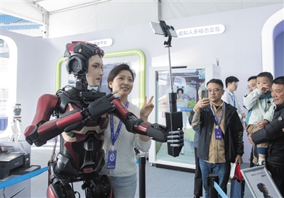 ◀10月24日,在第七届世界声博会上,一款人形交互机器人持自拍杆与观众合影。