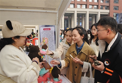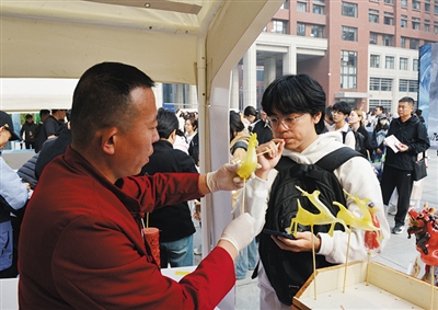 文旅集市区域左侧,我市各县区的农特产品、文创好物琳琅满目;右侧展示大同丰富的文旅资源,摆放着文旅资料手册及非遗文化物品,非遗传承人现场展示技艺,邀请大学生参与DIY制作伴手礼。