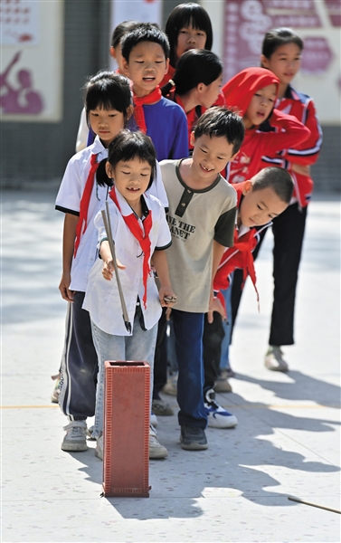 ▲在梧州市平浪希望小学,学生们在体育大课间练习投壶(10月25日摄)。