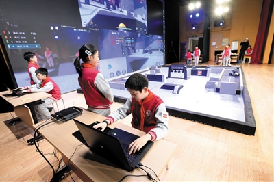 ▲11月4日,在北京市海淀区实验小学,学生操控机甲机器人进行对抗比赛。
