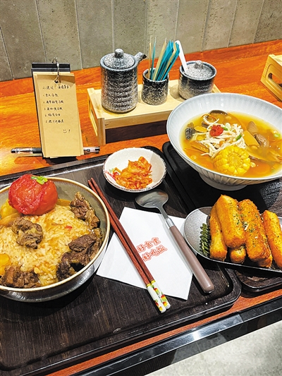 这家小店位于御东铂蓝郡伦敦街,是一家日式的料理店,相信很多看过《深夜食堂》的人要是来到这里,会恍惚感觉电影种的小店被搬到了现实当中。店家推荐了番茄牛腩饭和鸡汤饭,番茄牛腩饭里面有一整个的番茄,是维C满满,牛腩也比较软烂入味,汤汁浓郁,也许因为是日料,所以味道不像别家的牛腩饭那样味道重,相对清淡一些。鸡汤饭里面的食材很丰富,汤底是散养的老母鸡慢炖而成,里面还有虫草花、玉米以及各种菌类,鸡肉是撕好的鸡丝,看起来金灿灿的,让人感觉很有食欲。