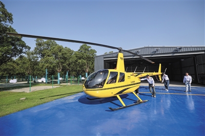 ▲11月5日,在湖州米旗通航直升机飞行基地,飞行教员带领学员把直升机推出机库,准备进行日常培训。