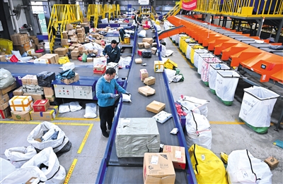▶ 11月8日,在中国邮政四川省眉山市仁寿县邮件处理中心,工作人员在智能快递流水线上分拣快递邮件。