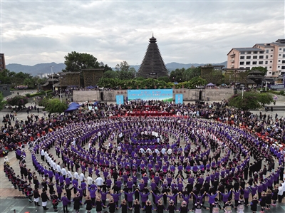 当日,湘黔桂三省(区)侗族群众聚集在广西三江侗族自治县多耶广场,载歌载舞,欢庆侗族多耶节。 新华社发