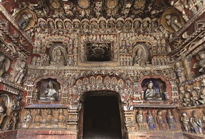 云冈石窟第10窟自去年2月10日封闭以来,开展了洞窟调查和日常养护工作。近日,各项工作已基本完成,具备开放条件。第10窟也称毗卢佛洞,是“五华洞”的一个洞窟,开凿于北魏太和年间,属于云冈石窟中期作品,前室北壁明窗至拱门之间,须弥山层峦叠嶂,山腰二龙交缠,山间有茂密的林木和竞奔的动物,雕刻中的建筑形象出现中国传统的瓦顶建筑、斗拱构件等元素,装饰中也出现了龙雀飞舞的形象,反映了开窟时社会各民族文化大融合的时代特点。