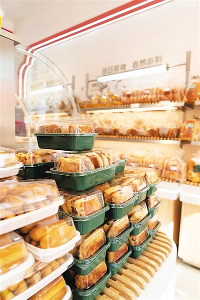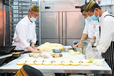 除了传统面包,“马兵月饼”在制作中式糕点上也极为用心,脆皮蛋糕、酸奶饼便是深受人们欢迎的两款糕点。脆皮蛋糕,选用优质面粉,加油、鸡蛋、糖进行充分打发,然后进行烘烤的一种传统中式糕点。刚出炉的脆皮蛋糕外皮呈琥珀色,内部是奶黄色,外皮香脆、口感柔软细腻,奶香味十足。酸奶饼是“马兵月饼”的创新糕点,用酸奶进行发酵,加入鸡蛋、糖、牛奶等烘烤而成。酸奶饼暄软绵密,口感清甜。当记者问起制作“秘籍”时,“没什么秘籍,产品好主要是材料好,比如酸奶、牛奶,我们只用伊利的,麻油只选用香气浓、色泽清亮的本地胡麻籽油”,“马兵月饼”的一位技师说。