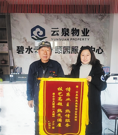 1月16日,碧水云天·颐园业主王女士将一面写有“情系业主,热情服务;技艺高超,热气满屋”的锦旗送给了物业维修部,以表达对其优质、高效服务的衷心感谢。