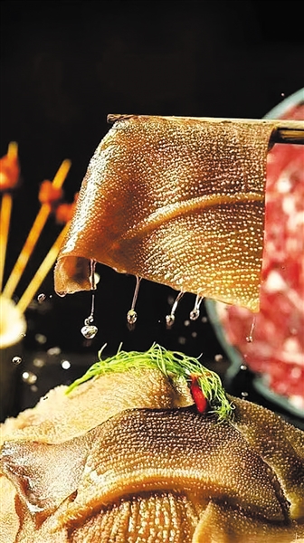 提起毛肚,是大多火锅店的必备菜品。蒙度毛肚火锅的招牌从店名就不难看出。该店的毛肚是在广袤无污染的草原自然放养的牛产出的,不仅如此,与传统水发和碱发技术不同,“蒙度”采用的木瓜蛋白酶嫩化技术是由西南农业大学研发的一种新型食品处理技术。其过程中,蛋白酶把毛肚中的胶原蛋白和弹性蛋白进行适当分解,使氨基酸之间的连接键部分断裂,破坏蛋白质结构,使水进入细胞间和细胞内,达到吸水复原的目的。同时由于蛋白质的结构性质发生了改变,可以产生“脆嫩化渣”的口感,而又不损伤其营养物质。