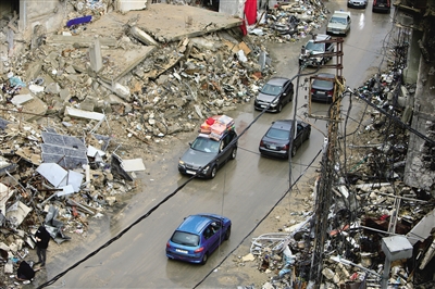 ◀ 11月27日,在黎巴嫩南部,人们驾车返回家园。