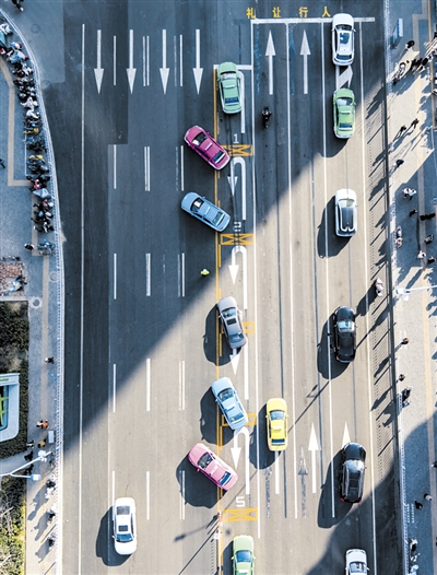 ▲ 11月28日,多台车辆在兰州市城关区五里铺十字“联动式调头点”掉头(无人机照片)。