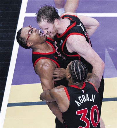 12月3日,猛龙队球员巴恩斯(上左)、珀尔特尔(上右)与阿巴吉在比赛中庆祝得分。