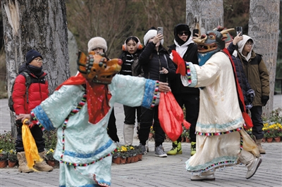 ▲12月7日,在九寨沟景区,游客观赏藏戏表演。