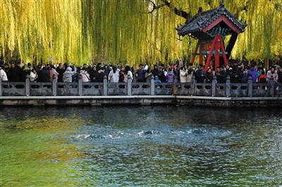 入冬以来,山东省济南市城区的各处名泉泉水喷涌有力,吸引游客前来观泉游览。