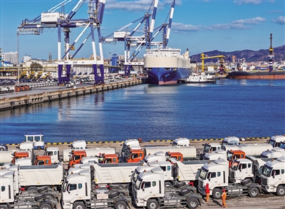 ▲ 12月8日,一批卡车在山东港口烟台港等待装船(无人机照片)。