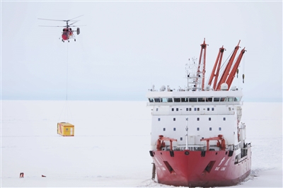 ◀直升机将“雪龙”号上的货物运送至中山站(12月7日摄)。