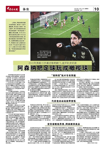上周末,阿森纳再次通过角球得分,客场1∶1战平富勒姆,而在此之前的一场比赛中,阿尔特塔的球队同样是依靠两个角球战胜了曼联;再往前数,11月30日客场击败西汉姆与11月26日客场战胜里斯本竞技,阿森纳都通过角球取得了进球,本赛季赛程还没走完一半,阿森纳已经九次通过定位球(不含点球)敲开对方大门,名宿贝尔巴托夫调侃说:“阿森纳就是新时代的斯托克城!”