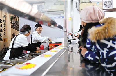 ◀ 12月12日,社区餐厅的服务员在给顾客打餐。