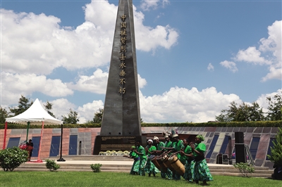 ▲ 12月10日,在赞比亚卢萨卡省的坦赞铁路纪念园,中国援赞比亚医疗队代表向中国烈士纪念碑献花。