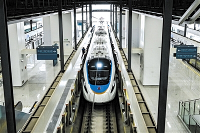 ▶ 12月20日,试运行的市域线机场联络线列车驶入上海虹桥2号航站楼站。