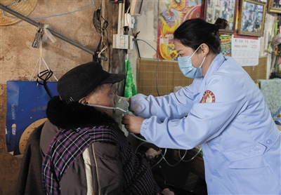 ◀12月21日,浙江省诸暨市浬浦镇中心卫生院的网约护士上门为老人做雾化。