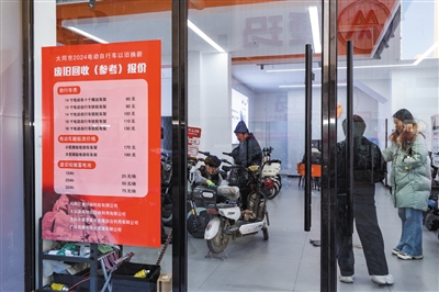 “政策补贴加上厂家优惠,一辆电动自行车能节省700到800元。”在东信电动车一条街,各品牌电动自行车销售门店集聚于此,以旧换新宣传海报引人注目。