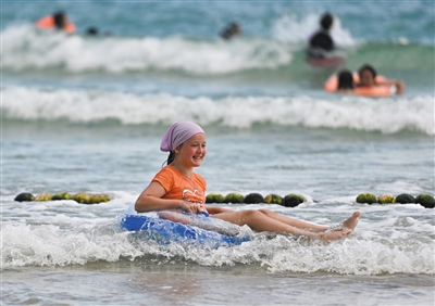 ▲8月28日,外国游客在三亚市大东海游玩。