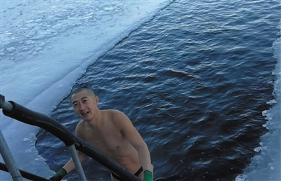 破冰开泳道、脱去冬衣、更换泳衣,开始做泳前拉伸运动,让身体迅速适应气温。6时30分许,王日成毫无惧色地从岸边的梯子下到冰冷的河中,开启了独特的“血管体操”。