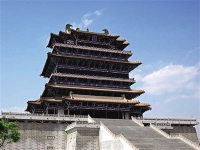 穿过偌大的广场,走过小桥,一座雄伟的高楼浮现在眼前,这就是鹳雀楼。此楼始建于北周时期,初为宇文护镇守蒲州时建造的一座军事戍楼,黄河流域的鹳雀鸟经常栖息于此楼上,故而得名鹳雀楼。当年宇文护建造的鹳雀楼,至元初毁于战火,后多次重建。现在登临的鹳雀楼,重建于1997年,也是四大名楼中最高的一座。此楼有58000吨之重,其梁柱皆采用钢筋混凝土仿古建筑设计建造,异常坚固大气。