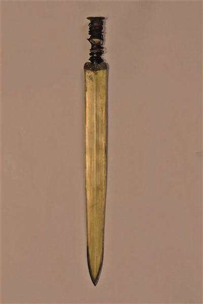 剑乃短兵之祖,近搏之器。因其携之轻便,佩之神采,用之迅捷,素有“百刃之君”之美称。一名优秀的剑客需要把剑深藏在怀中,隐忍等待,当足够靠近敌人的瞬间,突然出击,刺出那决定胜负的一剑。另外,地形以丘陵、盆地为主的吴越地区,战争主要依靠水兵和步兵“短兵相接”,这些或是“剑”在春秋战国时期格外盛行的原因。此间,吴越兵器锋利无比盛誉天下。这把战国越王者旨於睗剑蕴含越国匠师们首创的复合铸造技术,剑身中脊及两从由不同成分之青铜嵌铸而成。剑身中脊硬度低而韧性高,剑不易折断;两从硬度高,可提高实战时的杀伤力,并保持不锈不蚀。剑柄根据使用习惯设置铜箍,为剑的使用者提供了极好的握持体验,再缠上丝质的缠缑(gōu)以防打滑。这2400多年前的“人体工学设计”令人感叹。