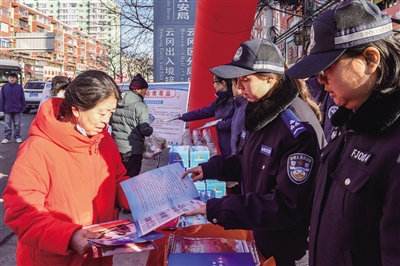 图为活动现场民辅警向市民讲解宣传资料内容。