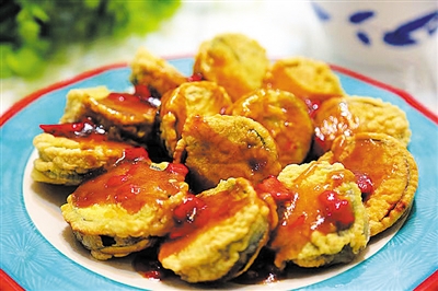 炸好的茄盒捞出装盘,搭配糖醋酱一起食用,口感酸甜可口,茄盒外皮酥脆,内里的肉馅更具滋味,吃起来甜酸开胃,老人小孩都喜欢。